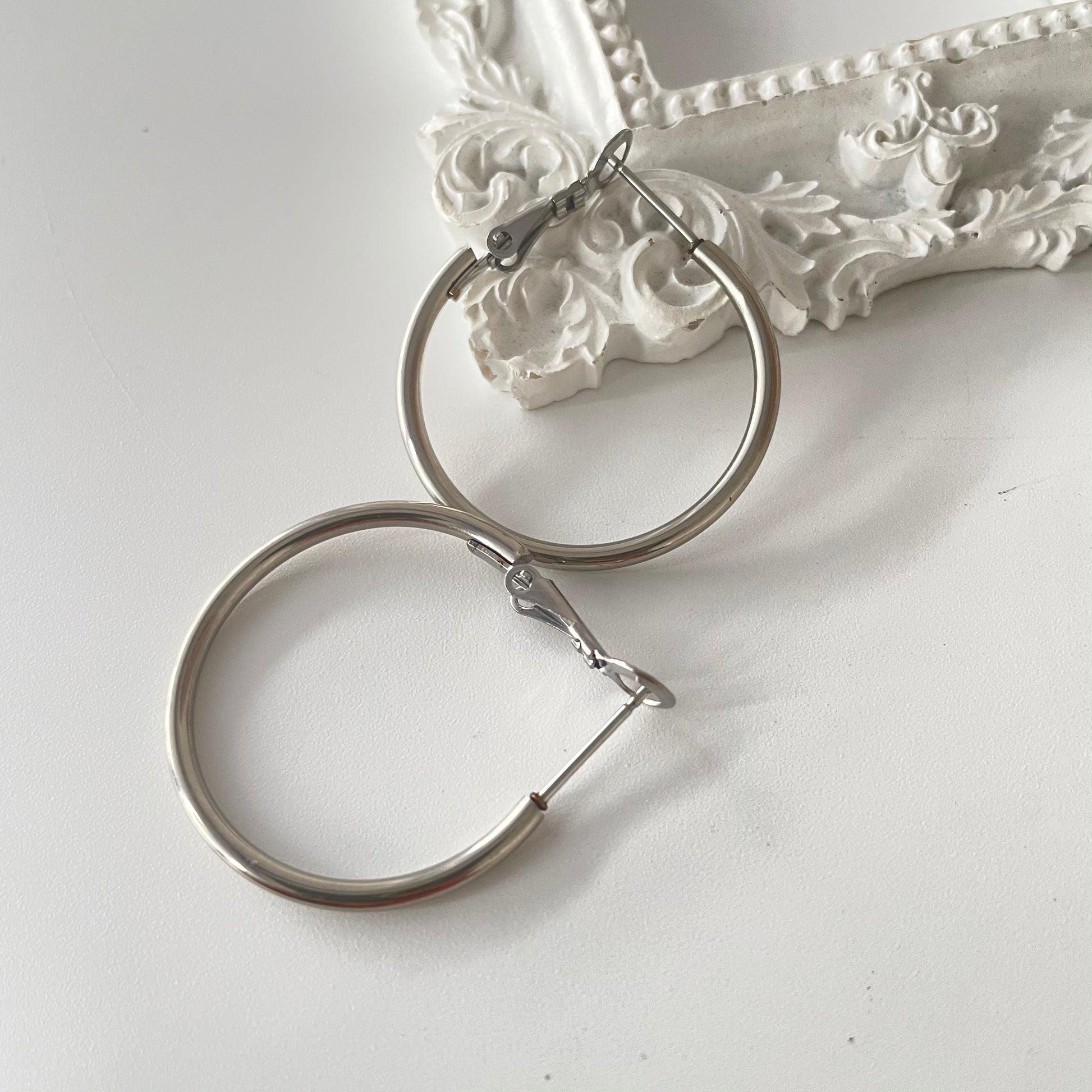 Silver hoop earrings, 3 cm in diameter, made of stainless steel for greater durability.